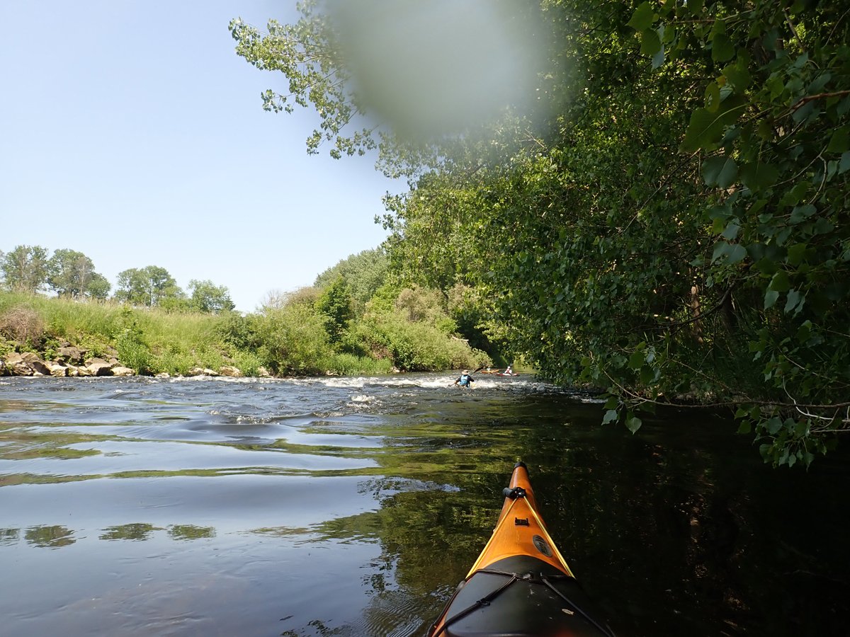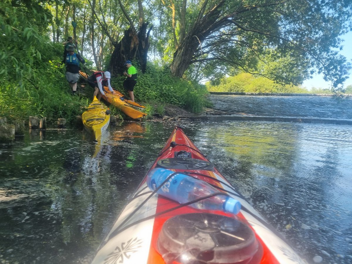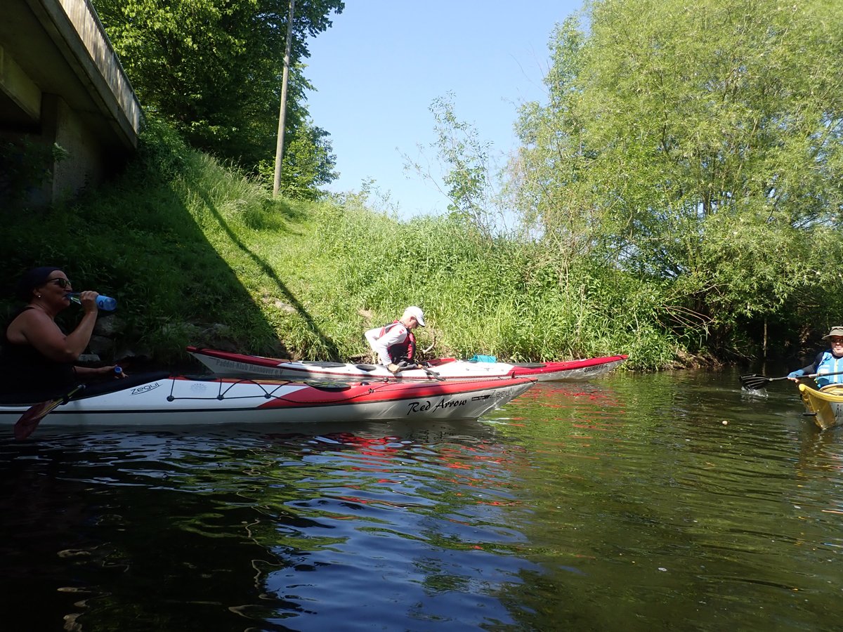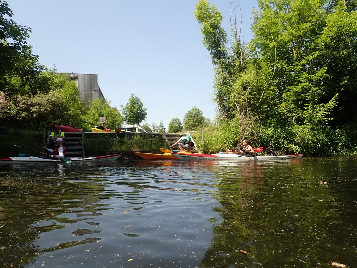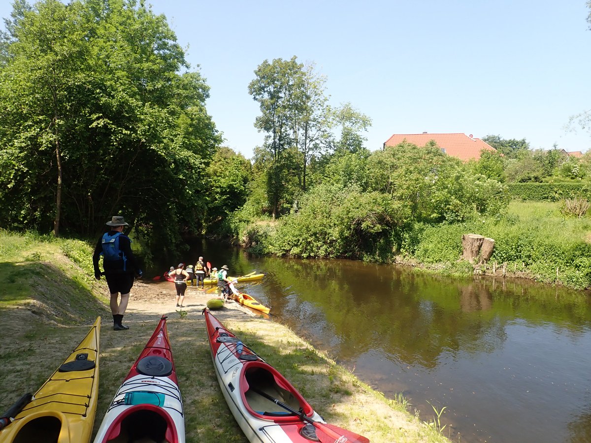 Gronau: In der Vergangenheit haben wir immer direkt hinter dem Wehr umgetragen. Das ist eine recht mühsame Sache insbesondere beim Einstieg mit meist wenig Wasser. Diesmal sind wir den Wehrkanal durch Gronau gepaddelt und kommen dann nach gut einem Kilometer am Lachszentrum an. Hier gibt es sogar einen für Leine-Verhältnisse guten Steg und eine sehr angenehme Rampe, um zum Fluss zu kommen und wieder einzusetzen. Unbedingt zu empfehlen.