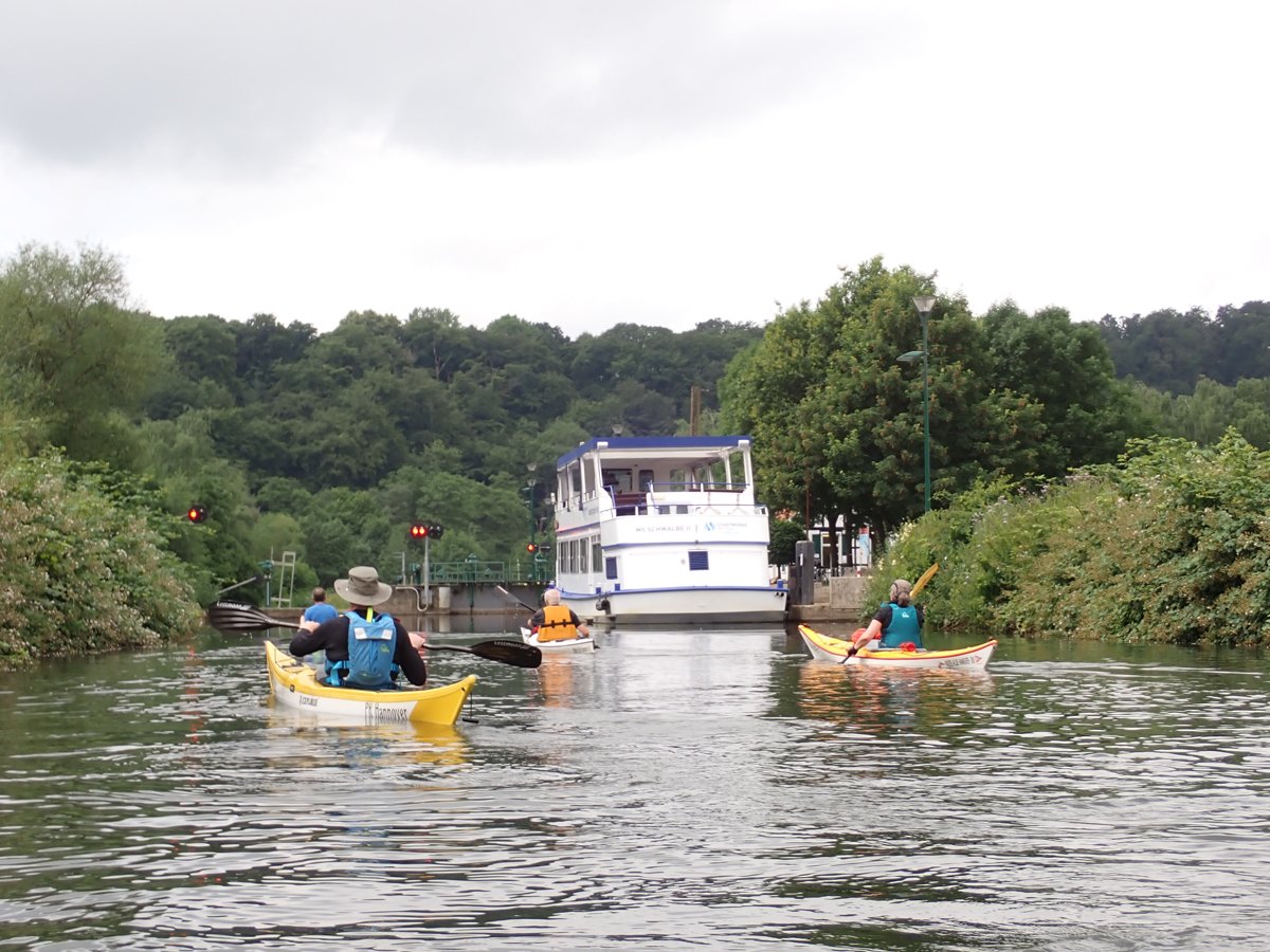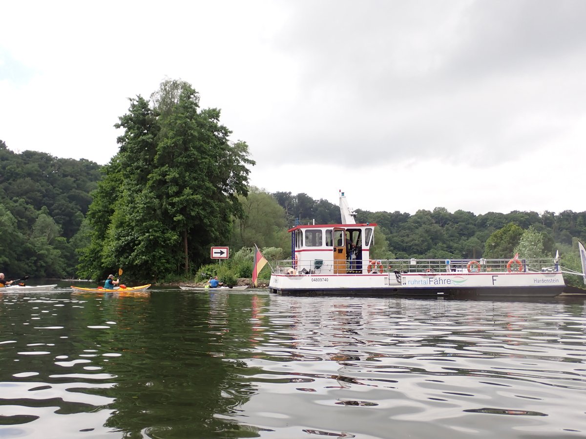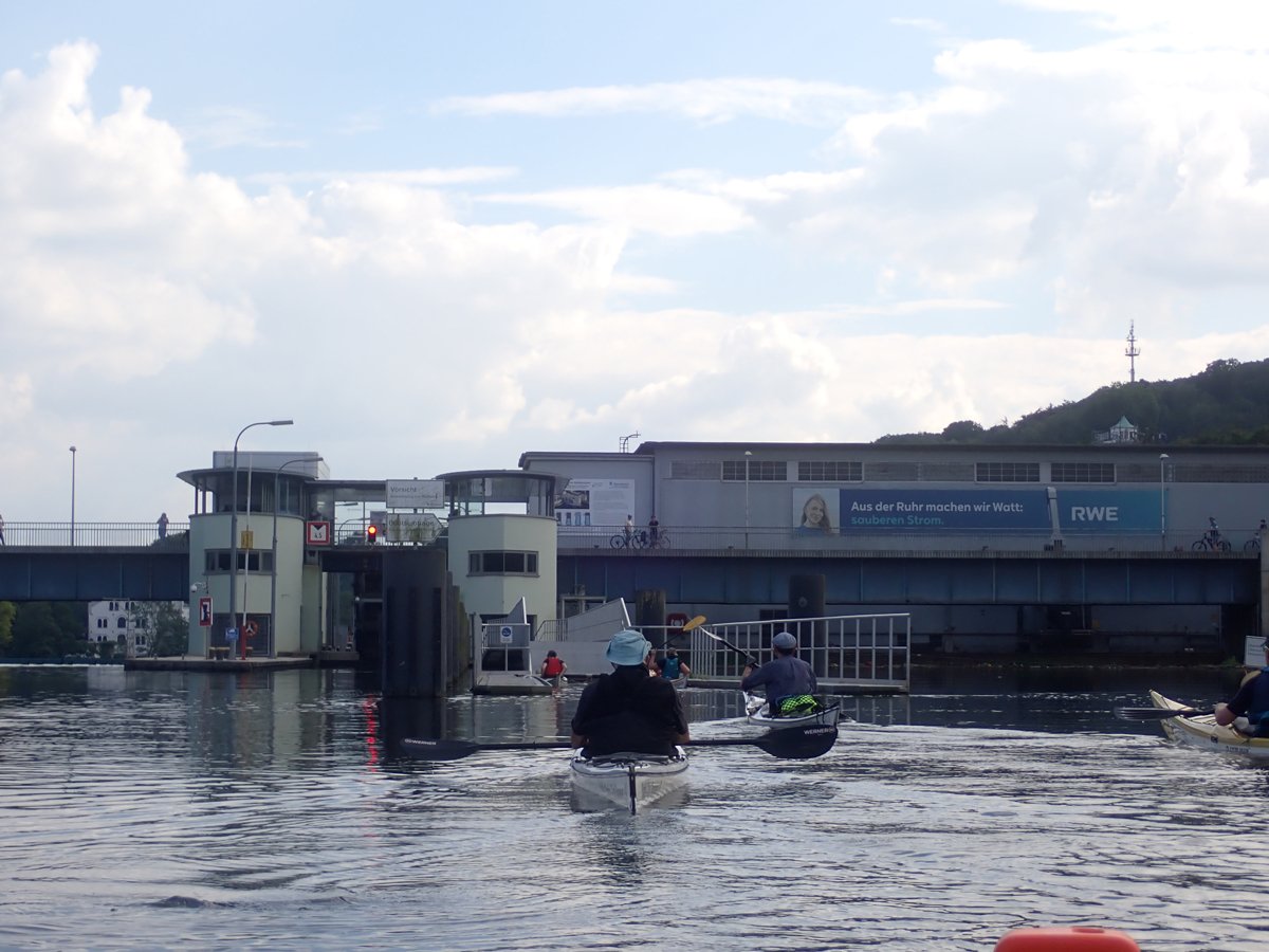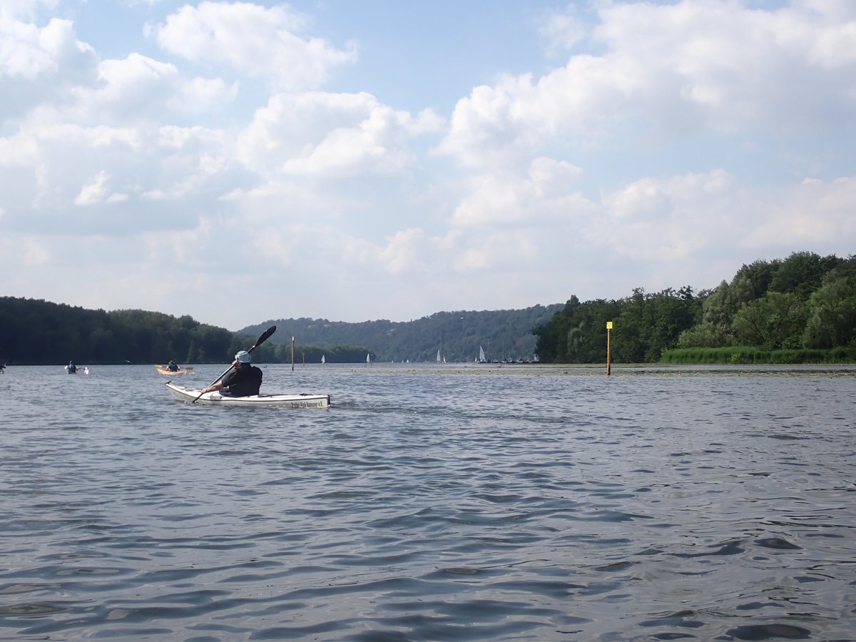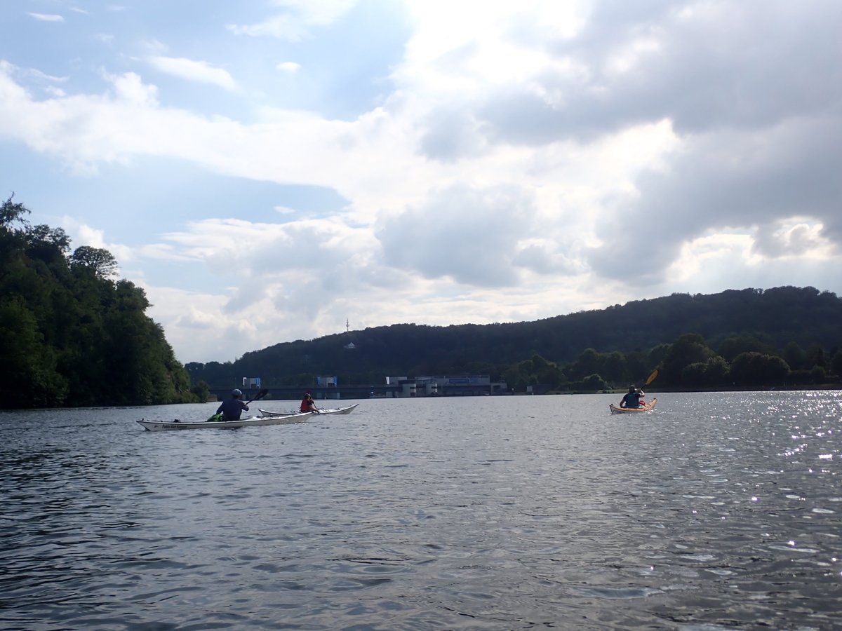 An den drei Folgetagen machten wir ganz unterschiedlich lange Touren auf der Ruhr. Insgesamt wurde die ca. 60 Kilometer lange Strecke von Hagen-Vorhalle bis Essen-Werden gepaddelt. Kemnader See und vor allem der schöne Baldeneysee lagen auf der Strecke. Ruhige Abschnitte wechselten sich mit munterer STrömung ab, an einigen Wehren gab es spannende Bootsgassen, besonders hervorzuheben ist hier die sehr lange und breite Bootsgasse in Hattingen.
