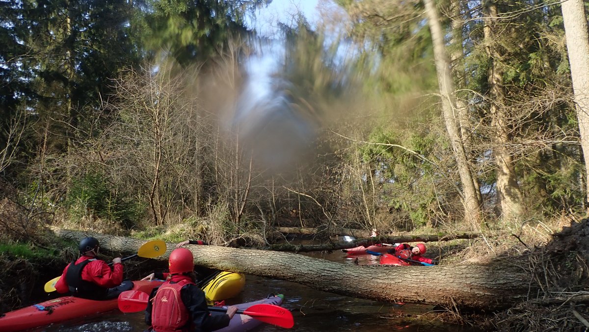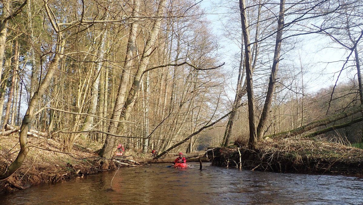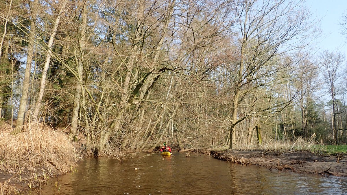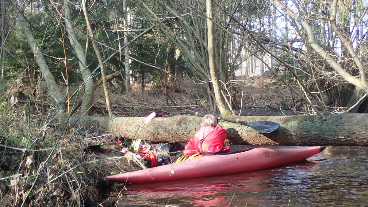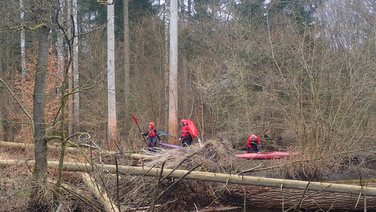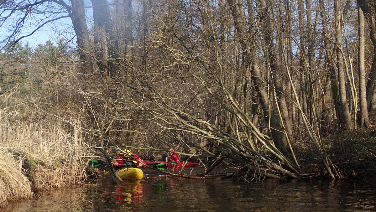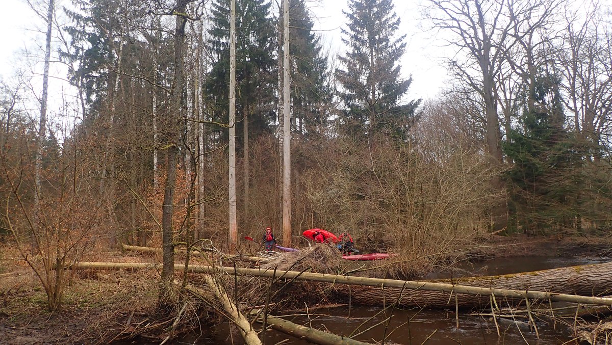 Der Plan war, bei ablaufendem Hochwasser noch mal einen kleinen Bach zu paddeln, der bei Normalwasserständen nicht befahrbar ist. So ging es auf die Aschau und von dieser weiter auf die Lachte bis zur nicht ganz so "blauen" Brücke. Die 14 Kilometer sollten sich allerdings als extremer Hindernislauf herausstellen: Es lagen einige Bäume im Bach und die Ufer waren nicht immer umtragefreundlich.