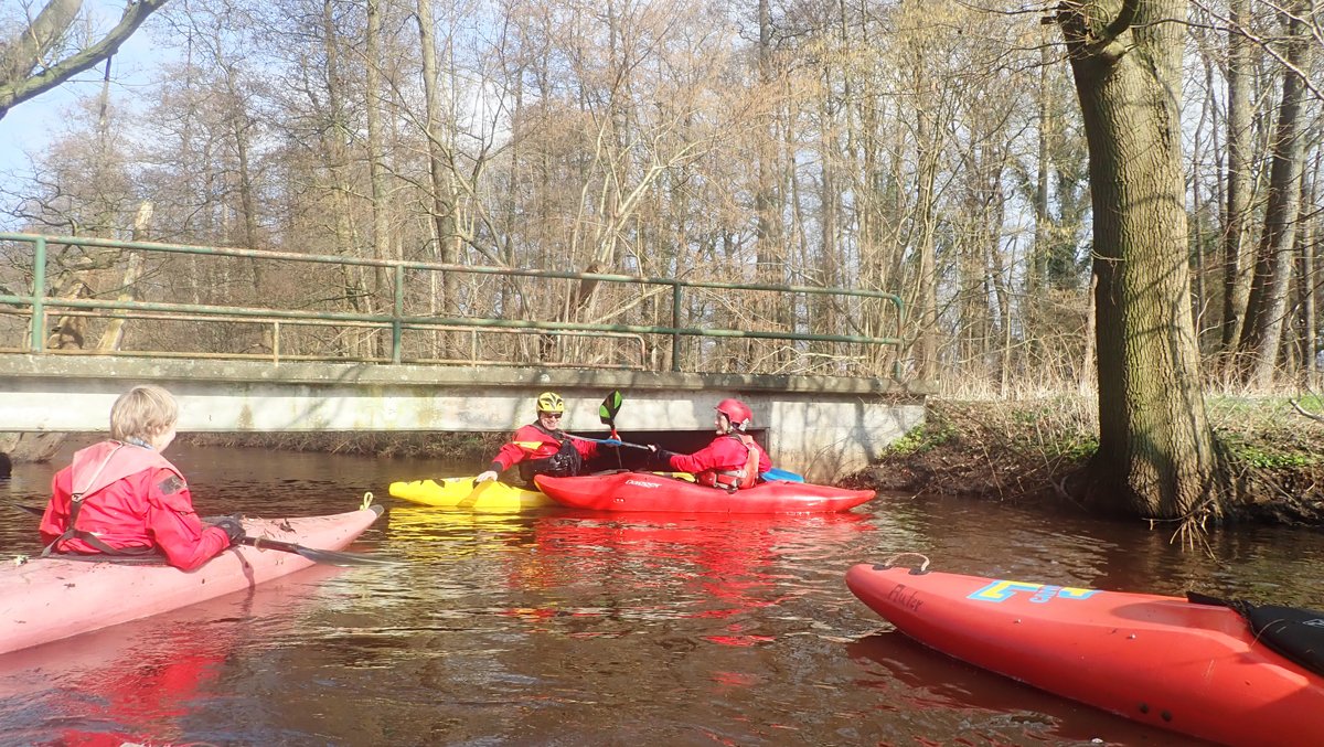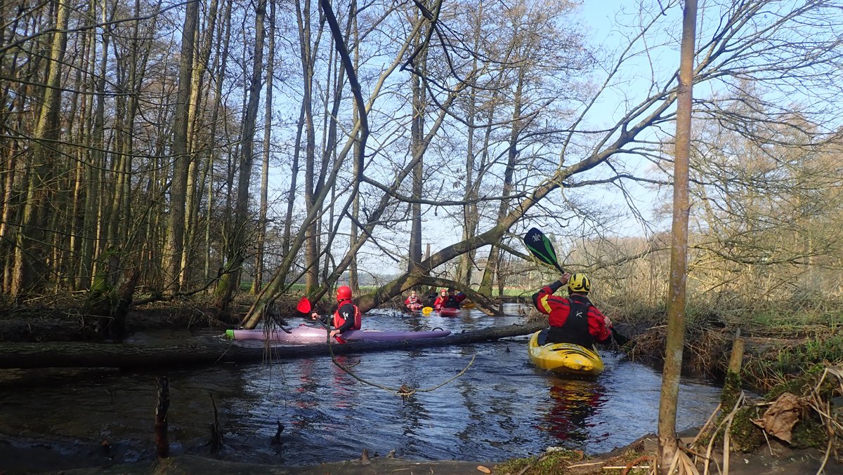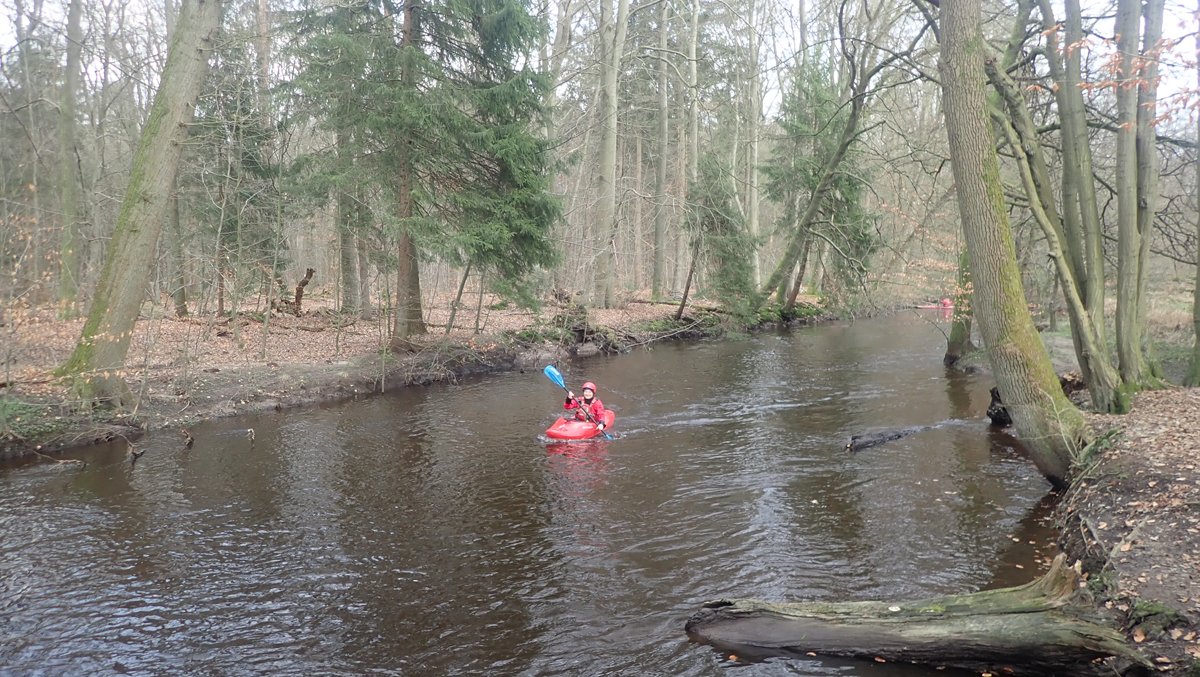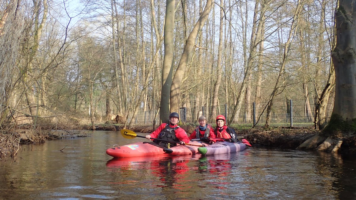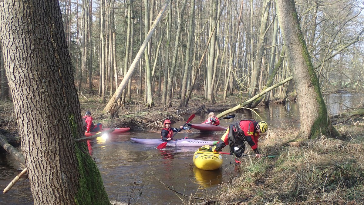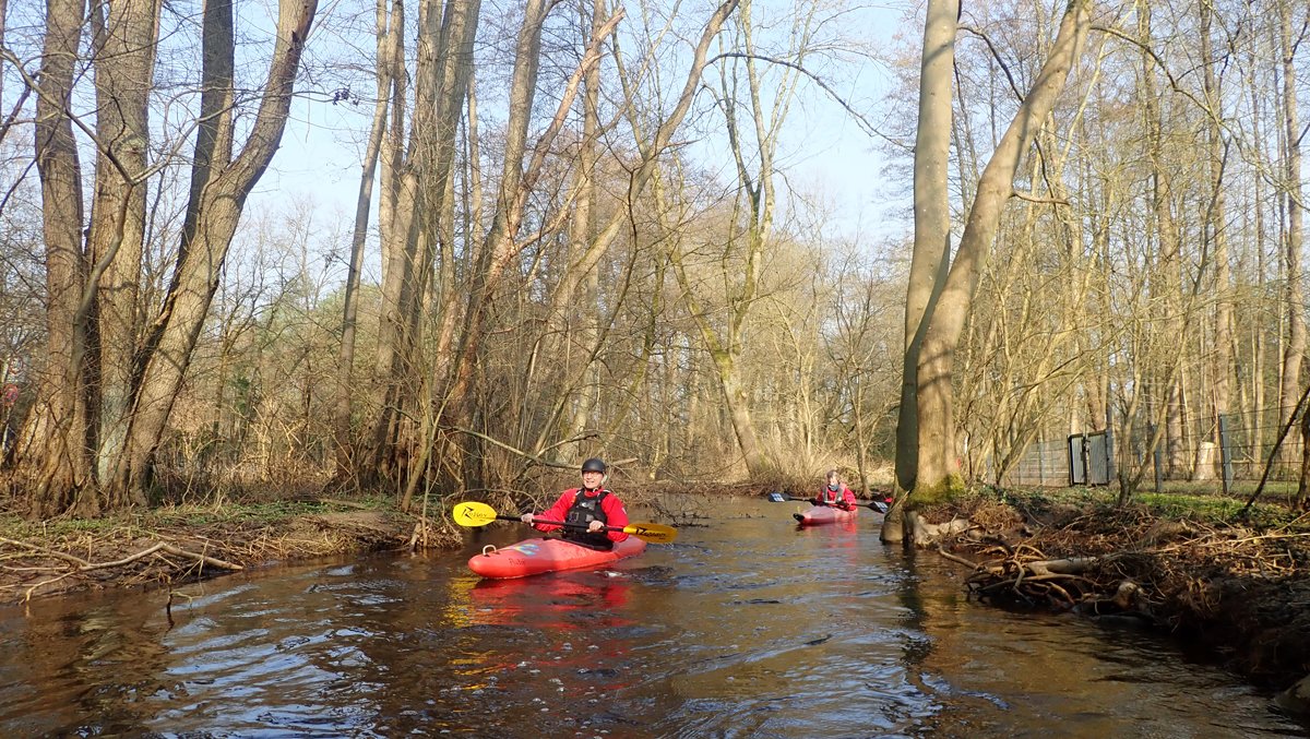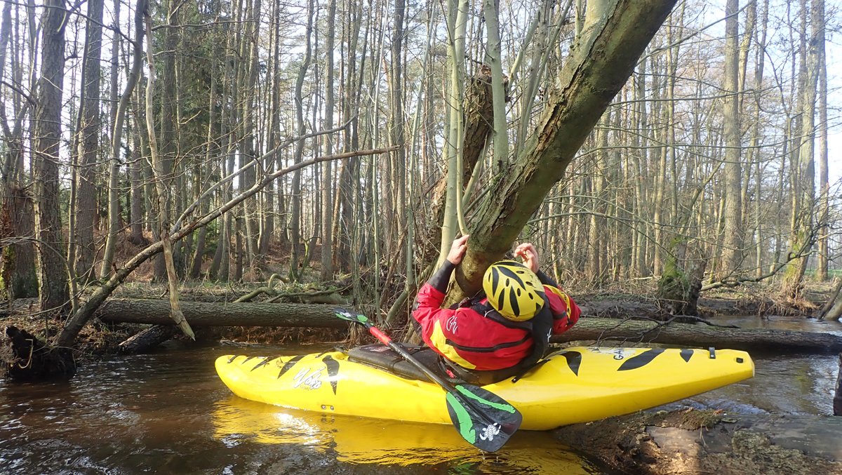 Der Plan war, bei ablaufendem Hochwasser noch mal einen kleinen Bach zu paddeln, der bei Normalwasserständen nicht befahrbar ist. So ging es auf die Aschau und von dieser weiter auf die Lachte bis zur nicht ganz so "blauen" Brücke. Die 14 Kilometer sollten sich allerdings als extremer Hindernislauf herausstellen: Es lagen einige Bäume im Bach und die Ufer waren nicht immer umtragefreundlich.