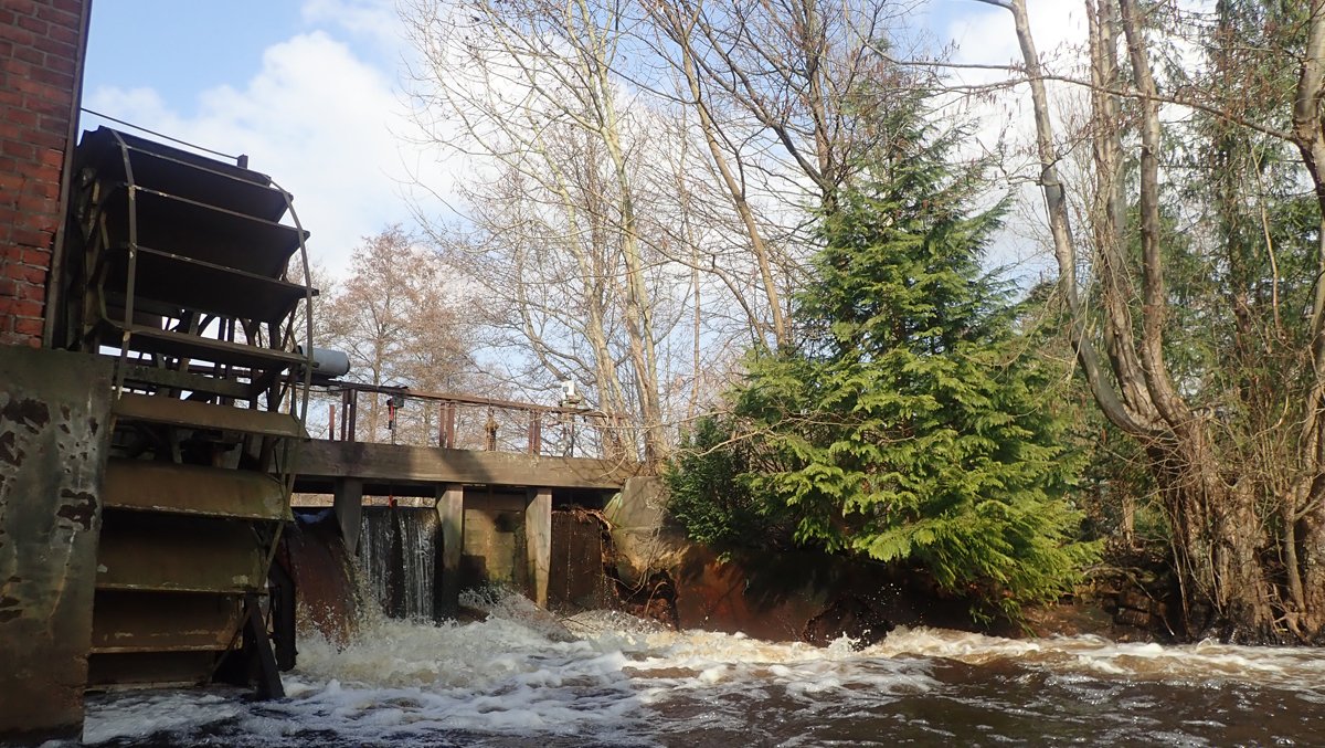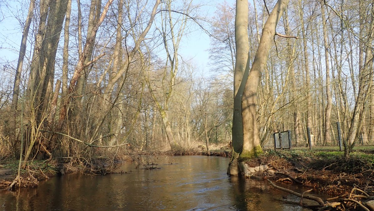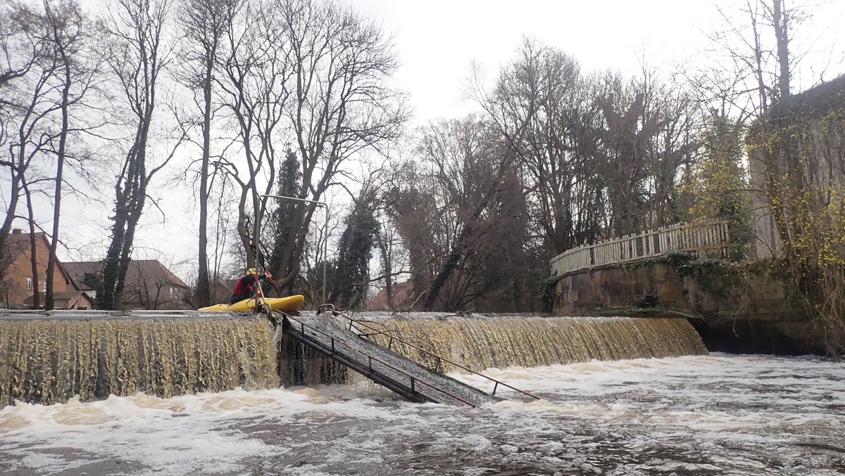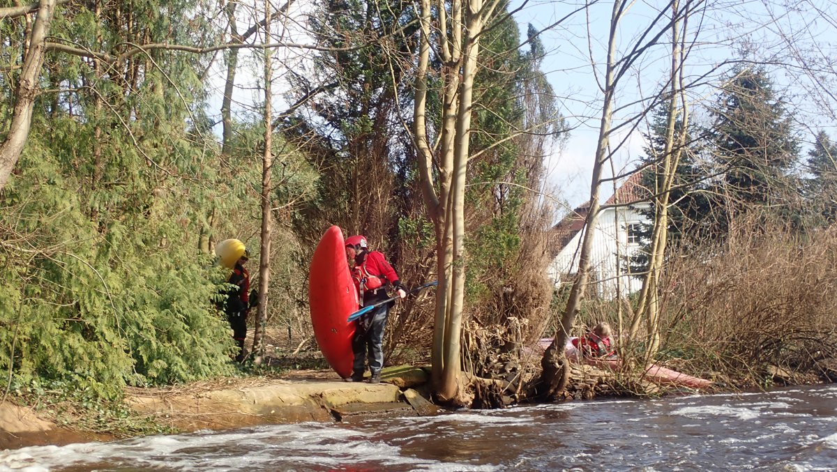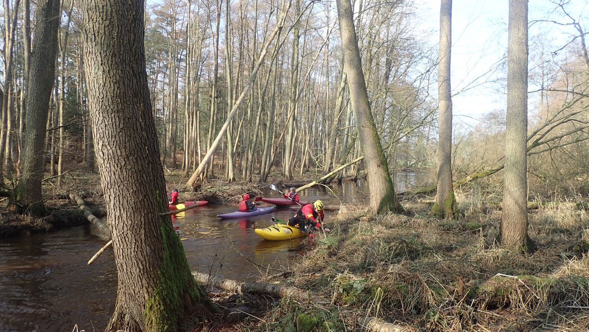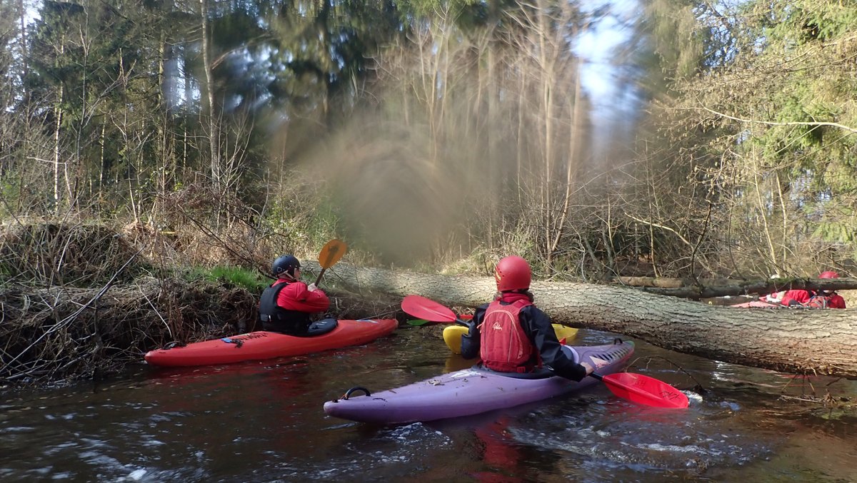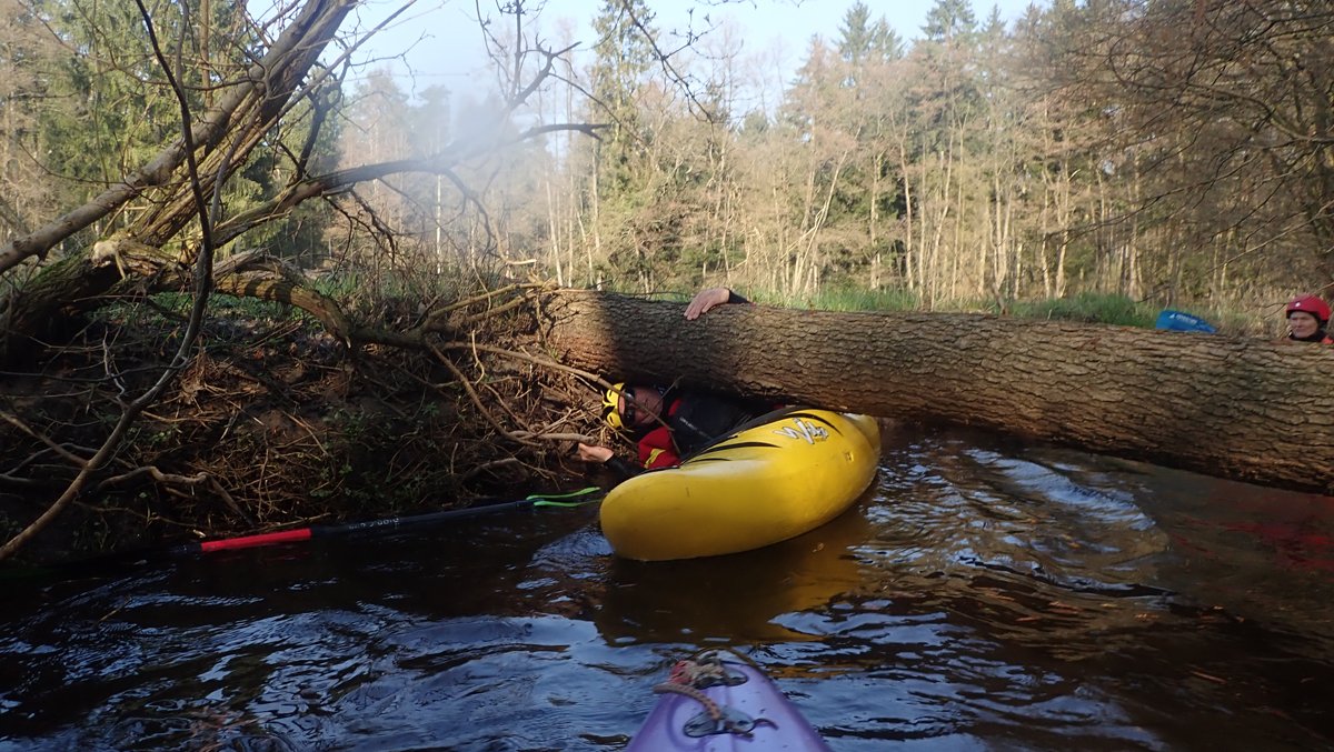 Der Plan war, bei ablaufendem Hochwasser noch mal einen kleinen Bach zu paddeln, der bei Normalwasserständen nicht befahrbar ist. So ging es auf die Aschau und von dieser weiter auf die Lachte bis zur nicht ganz so "blauen" Brücke. Die 14 Kilometer sollten sich allerdings als extremer Hindernislauf herausstellen: Es lagen einige Bäume im Bach und die Ufer waren nicht immer umtragefreundlich.