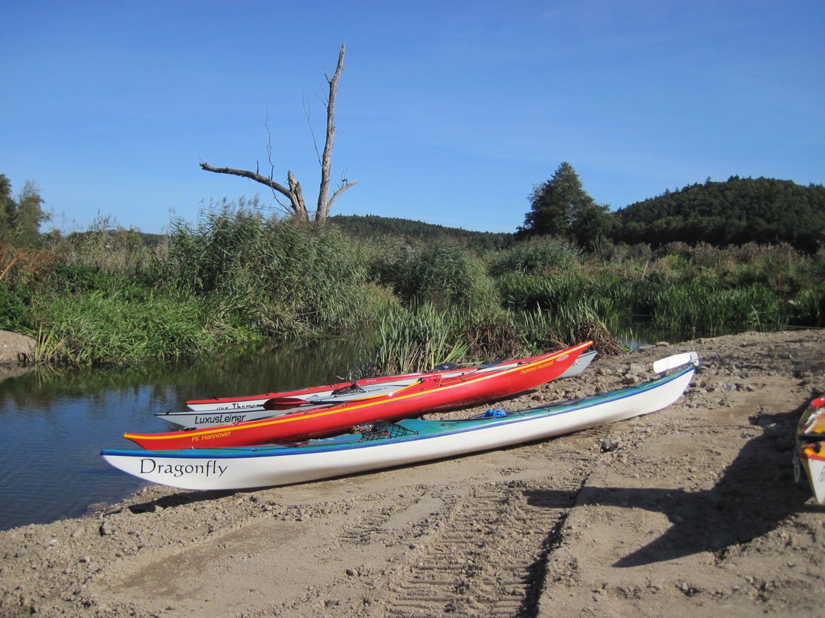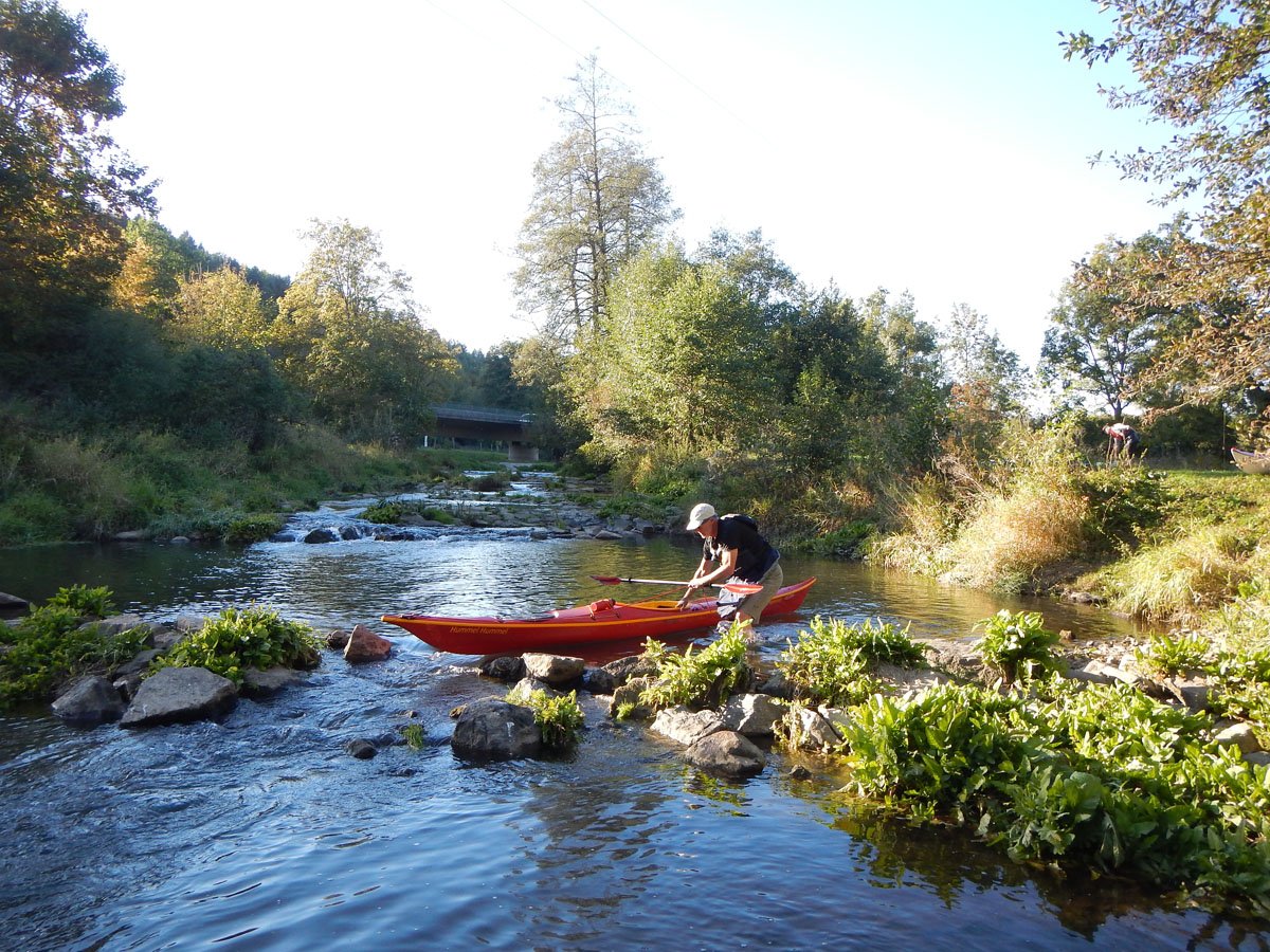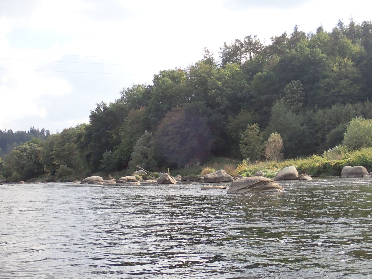 Regen: Zum Schluss folgten zwei Fahrten auf dem Regen. Die erste Regen-Tour ging von Nittenau nach Ramspau: Nur eine Umtrage, die dann aber recht lang ausfiel. Ansonsten ein grandioses Flussbild mit zahlreichen riesigen Findlingen im Bach, aber auch vielen großen Steinen dicht unter der Wasseroberfläche, so dass hier ständig absolute Aufmerksamkeit beim Paddeln angesagt war. Die zweite Tour auf dem Regen hatte einen ganz anderen Charakter: Sie führte von Cham bis Roding und war eine Fahrt durch das größte bayrische Naturschutzgebiet, in dem der Fluss weitestgehend frei mäandieren kann. Inklusiver vieler kleiner Inseln im Fluss und Aufteilung auf kleine Flussarme ergab sich eine interessante Fahrt ganz ohne Wehre.