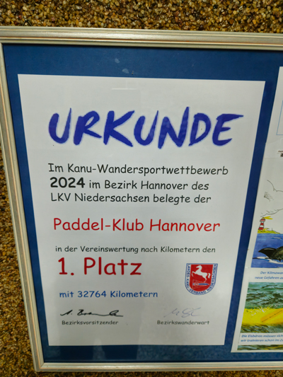 Wir können zurückblicken auf ein sehr erfolgreiches Jahr 2024. In der Kanusportsaison 2024 vom 01.10.2023 bis 30.09.2024 haben die Vereine in Niedersachsen wieder ihre Paddelleistung und damit Aktivitäten verglichen. Wir kommen in der zurückliegenden Saison auf mehr als 32.000 gepaddelte Kilometer. Dieses Ergebnis führt dann auch zum Platz 1 nach Kilometern in Niedersachsen!