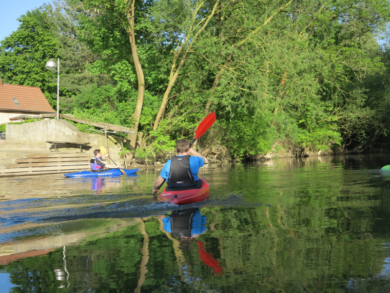 Für das Kennenlernpaddeln nutzen wir Einerkajaks, die typischerweise auf Kleinflüssen oder im Wildwasser gepaddelt werden - auch wenn die Leine weder klein noch wild ist. Diese Boote verlangen aber einen aktiven Fahrstil und das ist ideal, weil nicht nur wir, sondern auch das Boot direkt ein gutes Feedback zur Paddeltechnik gibt.